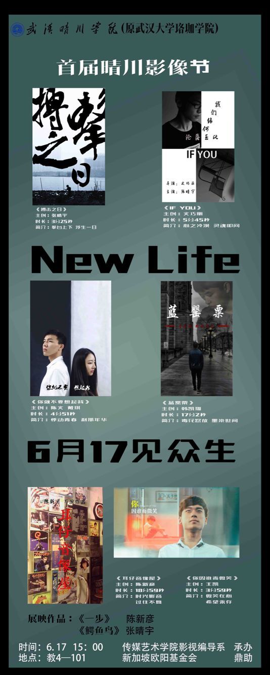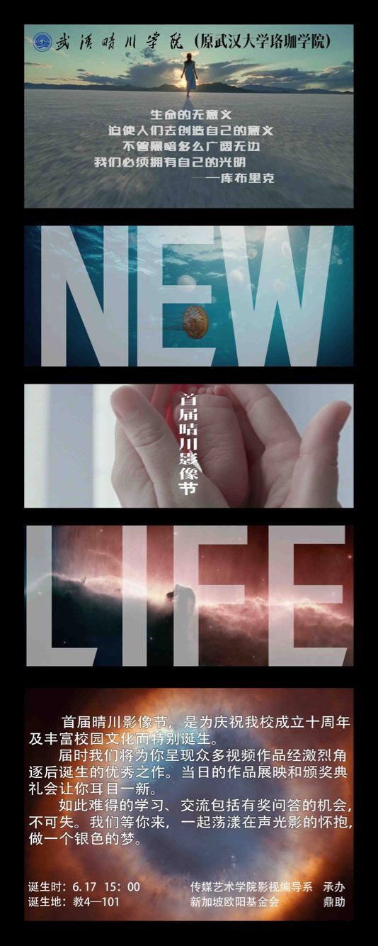 1《New Life概念宣传片》:此次影像节的概念主题定位new life,即“新生”。涵义有二,一是学校整体搬迁至现代化的美丽校园,顺利通过教育部评估,成功转设,迎来发展的“新生”。二是此乃首届晴川影像节,也可谓是校园文化创意活动的一次“新生”。据此,宣传片将诸多能够代表新生的电影画面予以剪辑,比如自然界的新生、人类的新生以及各种电影类型片的新生。