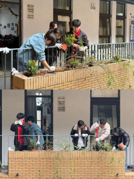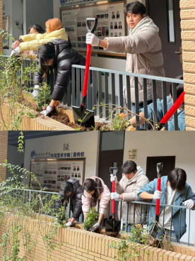 校内植绿小队的志愿者们于2026年3月18日下午13:30准时集结,签到领取花苗、盆栽、植树工具及惊蛰节气祝福卡后,携物资前往综合楼开启植绿敬师之旅。栽种现场热火朝天,志愿者们两两结对、各司其职,或持锹松土平整花槽,或小心取苗护根,或扶正填土固根,或细心整理枝叶、提水浇灌。大家撸袖俯身,虽沾泥湿额,植绿热情却丝毫不减,欢声笑语回荡在校园里。