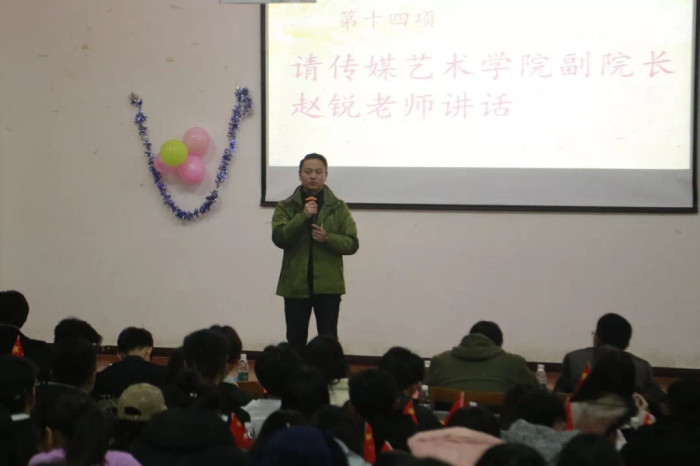 大会最后,传媒艺术学院副院长赵锐老师上台发表讲话,他表示团员学生代表大会不仅仅是为了换届而召开,要有一种神圣的使命感,学生干部要以身作则,努力完善自己,在工作中起到带头作用,同时也鼓励新一届团委学会干部要积极发扬长处、克服困难、再创传媒艺术学院辉煌。